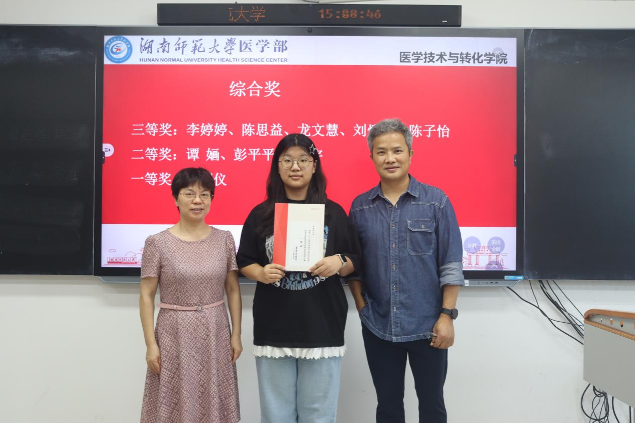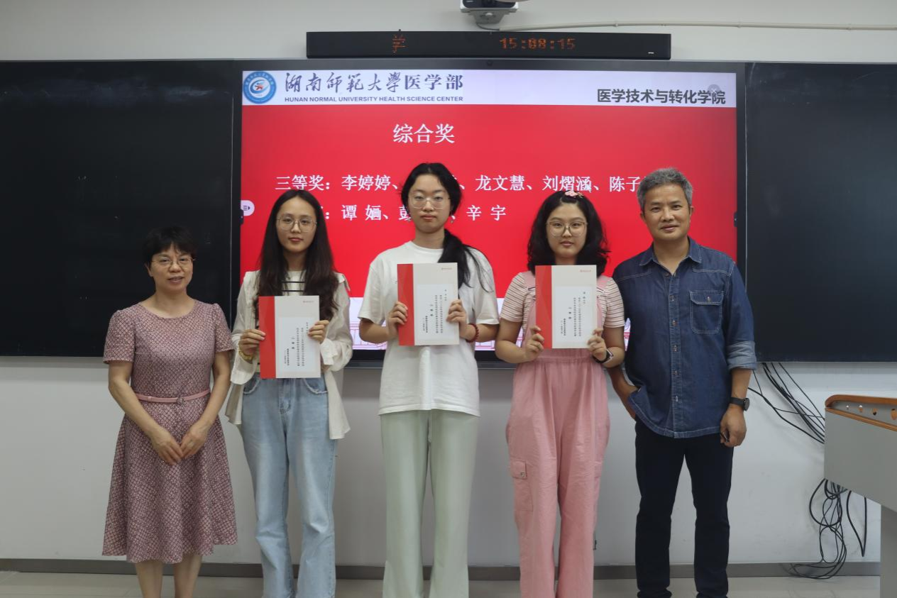 赛后于综合楼201教室举行了颁奖仪式。此次比赛共评选出综合奖9人,单项奖5人。医学部党工委副书记鄢朝晖、医学技术与转化学院副院长叶湘漓、检验系老师为获奖选手颁奖。