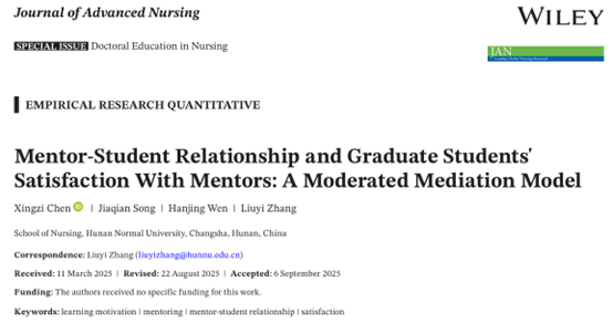 近日,开元官方· (中国)官方网站,护理学院科研工作再传捷报。由张六一副教授作为通讯作者,研究生陈幸梓等共同完成的研究论文《导师-学生关系与研究生导师满意度:一个有调节的中介模型》(Mentor‐Student Relationship and Graduate Students’ Satisfaction With Mentors: A Moderated Mediation Model)在国际护理学顶尖期刊《Journal of Advanced Nursing》(中科院一区)上发表。该研究深入揭示了师生关系影响研究生培养质量的内在机制,为提升研究生教育满意度提供了重要的理论与实践依据。