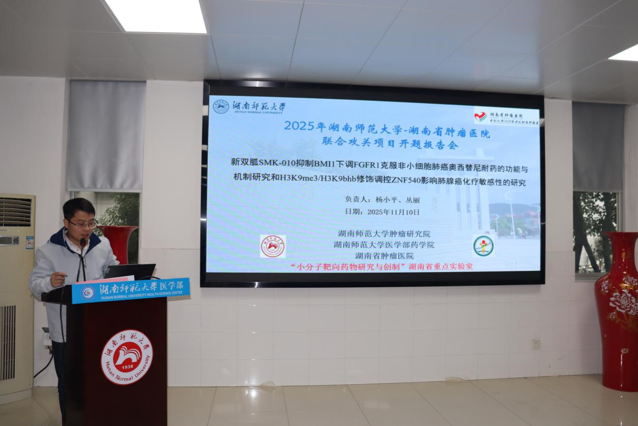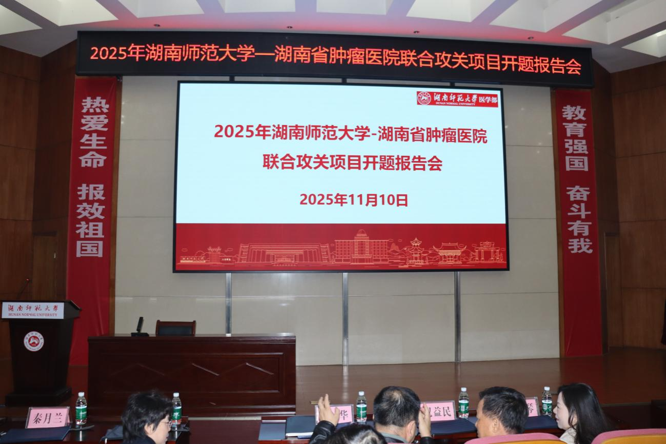 11月10日上午,湖南师范大学与湖南省肿瘤医院联合攻关项目开题报告会在开元官方· (中国)官方网站,仁医楼报告厅隆重举行。会议标志着双方共建的“湖南师范大学肿瘤研究院”进入实质性科研攻关阶段,首批11个跨学科联合项目全面启动,由医学部具体执行,旨在共同攻克肿瘤诊疗前沿难题。