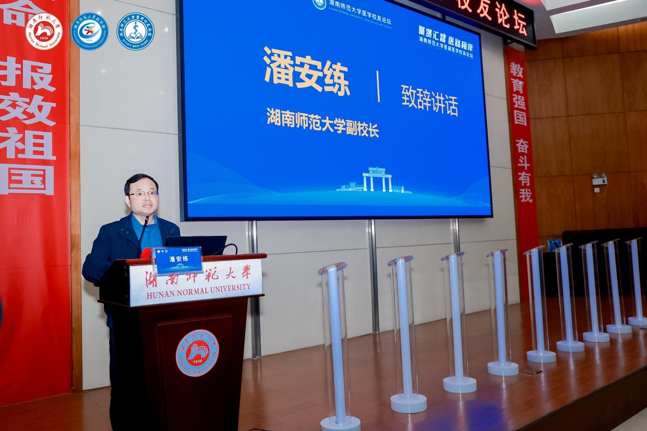 湖南师范大学潘安练副校长在致辞中深情回顾了学校医学教育的发展历程。他特别强调了当前“校友回湘”工作所面临的重大战略机遇,诚挚表达了学校期待与广大校友同心同德,共同打造医教协同、产教融合创新典范的愿景。