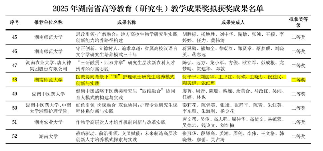 近日,2025年湖南省高等教育教学成果奖(研究生)获奖成果名单正式公布,湖南师范大学护理学院何平平、刘丽华、王卫红、何瑛、王晓芬、祝益民、陶美伊、张红辉完成的教学成果《医教协同背景下“4I”护理硕士研究生培养模式创新与实践》荣获二等奖。这一荣誉是我校护理学院深化研究生教育教学改革、推动医教协同育人的重要突破,更是研究团队多年深耕护理人才培养的丰硕成果。