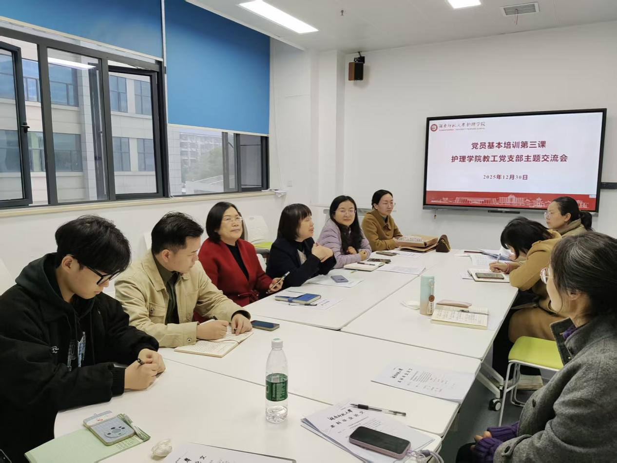 2025年12月30日下午,护理学院教工党支部在综合楼227教室举办党员基本培训第三课主题交流会。会议由党支部书记何平平主持,全体教师党员参加,研究生第二党支部学生党员代表,医学部党工委办公室主任杨洁芳到会督导点评。