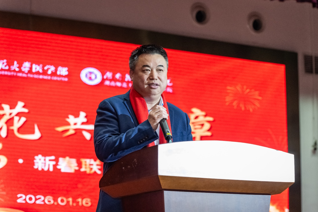 刘仲华代表学校向医学部全体师生员工、离退休老同志、附属医院的同仁、海内外校友和长期关心支持学校医学教育事业发展的社会各界人士,致以最美好的新春祝福。他充分肯定了医学部过去一年在人才培养、医联体建设、科研临床融合、成果转化等方面取得的丰硕成果,彰显湖南师大人的责任担当。他勉励医学部全体同仁立足新的历史起点,牢牢把握发展机遇。一要守正创新,接续奋斗,全力锻造实力强劲、特色鲜明的医学教育品牌,不断提升学科核心竞争力;二要深化协同,融合共进,进一步打破壁垒,在人才培养、临床救治、科研攻关的一体化道路上勇毅探索,构建高质量发展的新生态;三要胸怀“国之大者”,主动担当作为,自觉将医学部的发展融入“健康中国”和“健康湖南”的伟大征程,将个人的理想追求与团队的创新动能,汇聚成推动国家医疗卫生事业进步的磅礴力量。他最后号召全体师大医学人继续弘扬“仁爱精勤”的校训精神,以永不懈怠的姿态,共同谱写湖南师范大学医学事业更加辉煌灿烂的明天。