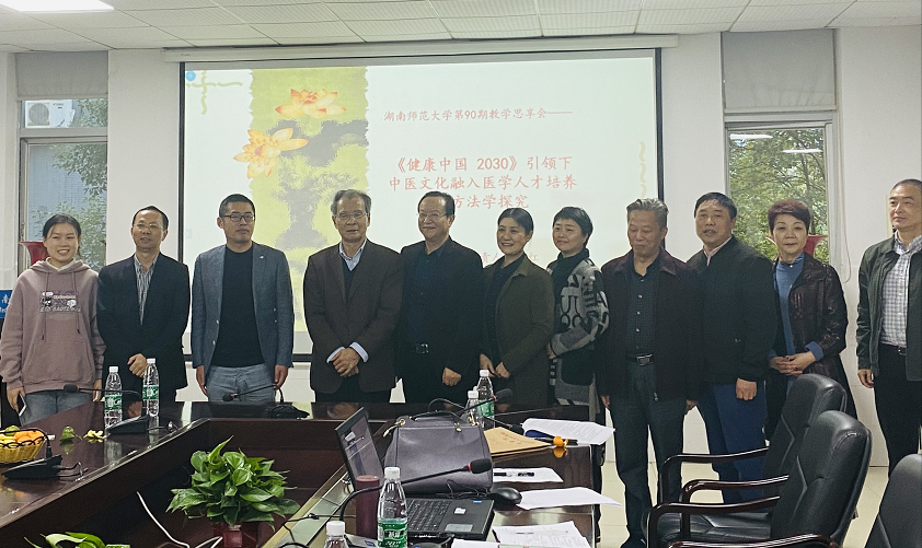 2020年11月19日下午,湖南师范大学第90期教师教学思享会在我院仁医楼207会议室举行。本期思享会主题为“《健康中国2030》引领下中医文化融入医学人才培养的方法学探究”,原我校常务副校长卢岳华教授、中医药学教研室主任及项目负责人金红教授担任主讲人。我院院长何祖平教授、副院长张坚松教授、教师教育学院廖志华主任出席,40余位我院老师和学生代表参加了此次思享会。