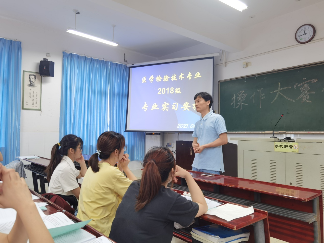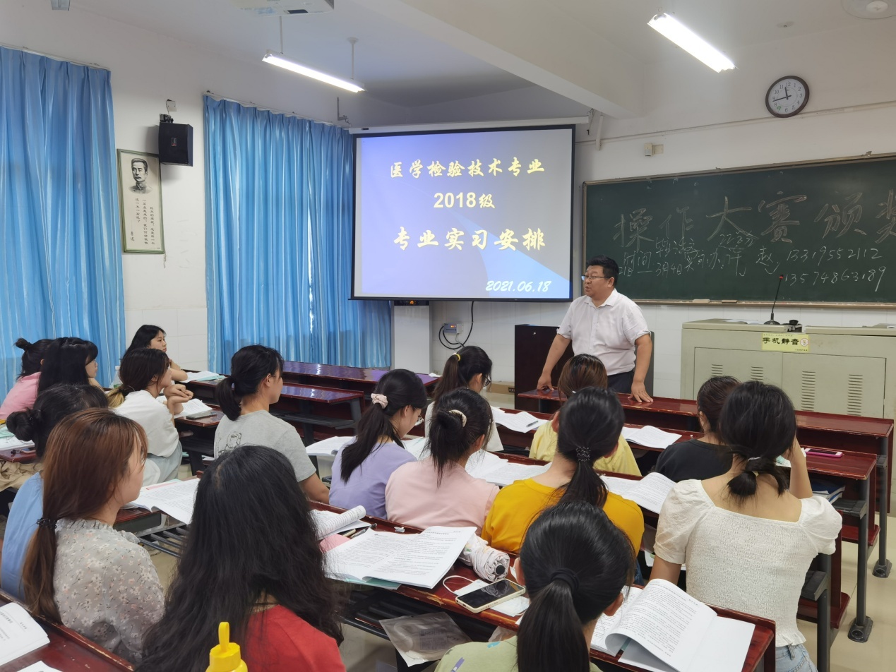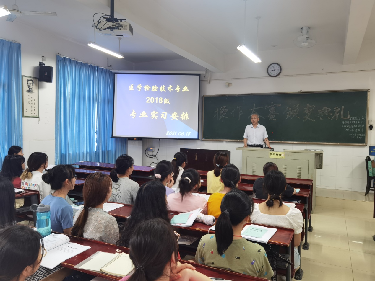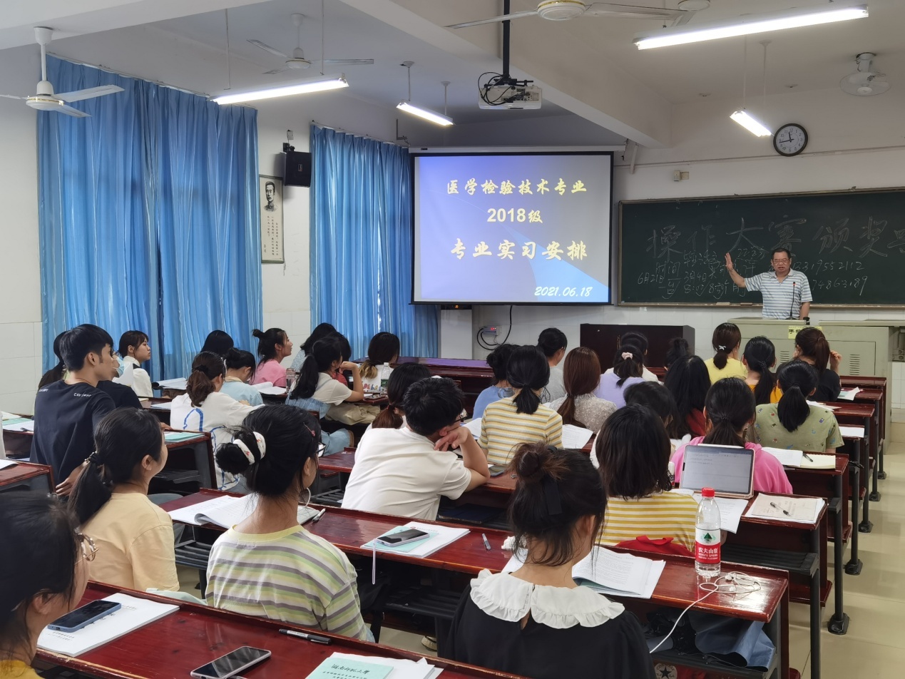 6月18日下午,2018级医学检验技术专业实习动员大会在仁医楼204教室召开。我院党委副书记陈松、实习办主任赵燕玲和副主任许建湘、学工办主任张晓红、医学检验系党支部书记袁仕善、医学检验系党支部组织委员李喜兵、年级辅导员罗宇涛及班导师钟志宏等出席会议。2018级医学检验技术专业全体学生参加动员大会。会议由医学检验系主任王庆林主持。
