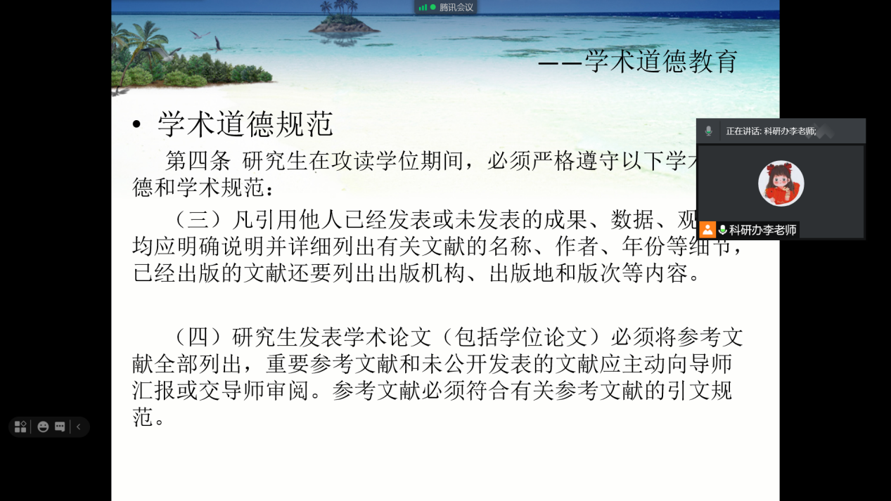 7月4日晚,我院举行2021级临床医学及护理学新入学研究生学术诚信和学术道德规范专题讲座在腾讯会议举行。会议由科研办主任阳美芳老师主持,李汇明老师和2021级临床及护理研究生新生共计250余人参加。