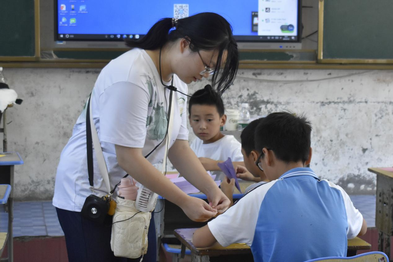 见面会上,支教组的成员们依次介绍了自己的姓名、来历以及此次支教的主要目的,让同学们对老师和接下来的课程有了初步的了解。在建立起初步的信任后,支教组老师带领大家开展了名为“破冰行动”的互动环节。每位同学都分到了几张彩纸,在老师的指导下,将这些彩纸折叠成飞机和简易的“飞机发射器”。当所有同学都完成作品后,大家一同来到室外,在老师的带领下,亲手放飞了自己制作的纸飞机。