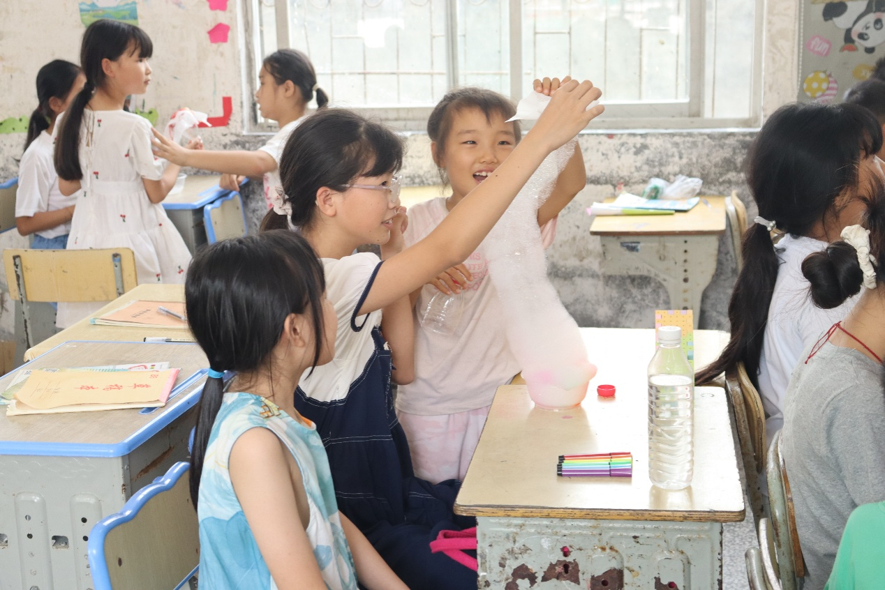 实验以生活化材料为载体,其实验材料如洗洁精、洁面巾、塑料瓶、色素、白糖、橡皮筋等均为日常用品。实践团成员按照规范流程,分步指导孩子们完成实验操作,帮助孩子们在动手过程中观察材料间的相互作用,直观感受化学现象的呈现过程。活动设置实践操作与成果评比两个环节。在实践操作阶段,实践团成员通过亲自演示的方式来讲解实验要点;评比环节则以“最漂亮的泡泡龙”为标准进行奖励,旨在激发孩子们的实践积极性与创新意识。评比中,孩子们展示各自制作的泡泡龙。最终,“最漂亮的泡泡龙”获得者在领取奖励时,主动分享了操作心得,带动了现场交流氛围。
