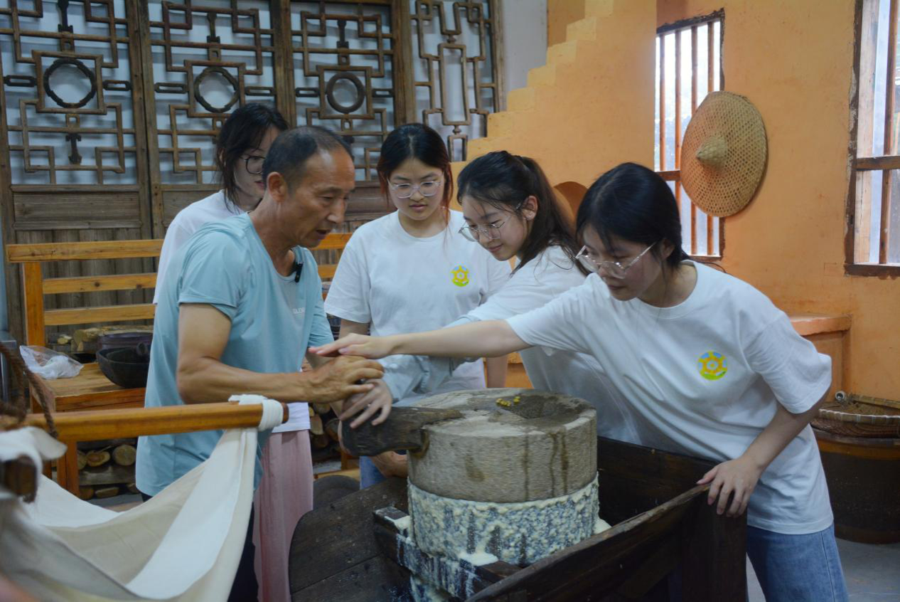 在长寿方氏老酱干作坊,厂长曹雷带领实践团成员参观生产车间。数余名工人规范作业,演示东北豆子经打磨、浸泡、磨浆等十余道工序,转化为韧性足、口味独特酱干的过程。曹雷介绍到,该作坊传承酱干的古法炮制,从卤水调配到炭火烤制,工序严谨。工厂同时招收村里留守妇女作员工。这一做法不仅为妇女创造了就业岗位,也推动了乡村就业与增收。
