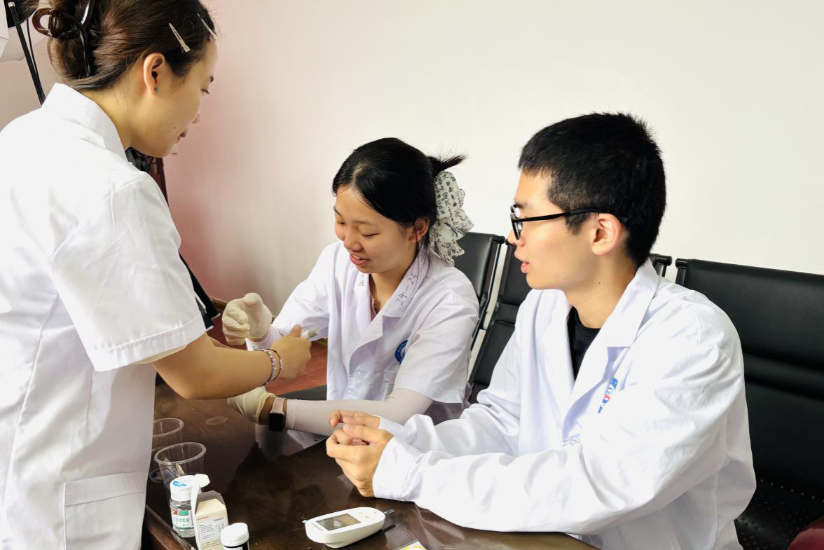 此次培训分为血糖与血压测量的理论与实操培训两个部分。教学过程中,信晓彤结合血糖与血压测量过程中所需的仪器,讲解了测量的具体要求、操作步骤和注意事项;在血压血糖测量的实操环节,信晓彤示范了血糖仪的规范使用和血压计的操作过程,一一列举各种关键操作细节。参与培训的实践团成员模拟真实情境,轮流扮演受诊者与工作人员,在反复练习的过程中积极互动,针对操作过程中出现的问题及时请教,切实掌握了血糖和血压测量的正确操作流程。