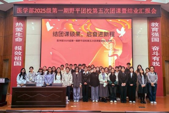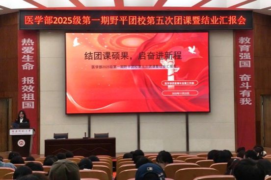 医学部团委青年发展工作部于11月22日晚在仁医楼学术报告厅,开展2025级第一期野平团校“结团课硕果,启奋进新程”主题团课暨结业汇报。本次活动旨在全面总结本期团校的学习成果,为成员提供一个展示学习感悟、交流心得体会的平台,进一步巩固和深化团课教育成效。
