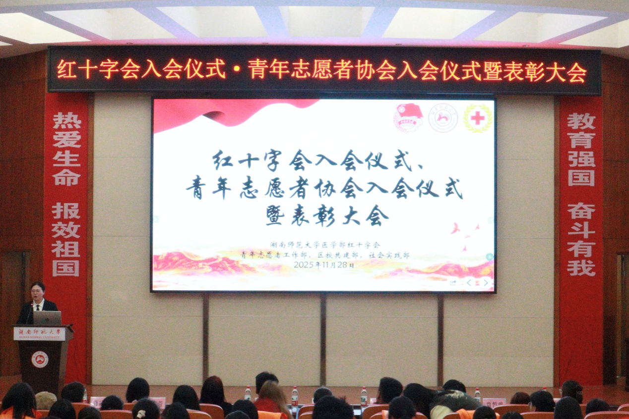 为发扬红十字精神,激发青年学子社会责任感,11月28日中午,医学部开展红十字会入会仪式、青年志愿者协会入会仪式暨表彰大会。此次大会由刘彦歆主持,长沙市红十字会志愿服务队队长、湖南师范大学红十字会特聘指导老师陈旭受邀出席。医学部团委副书记、2023级辅导员黄鸿剑,2025级辅导员高严严、熊永通出席大会。红十字会、青年志愿者协会全体成员以及医学部部分同学参加。