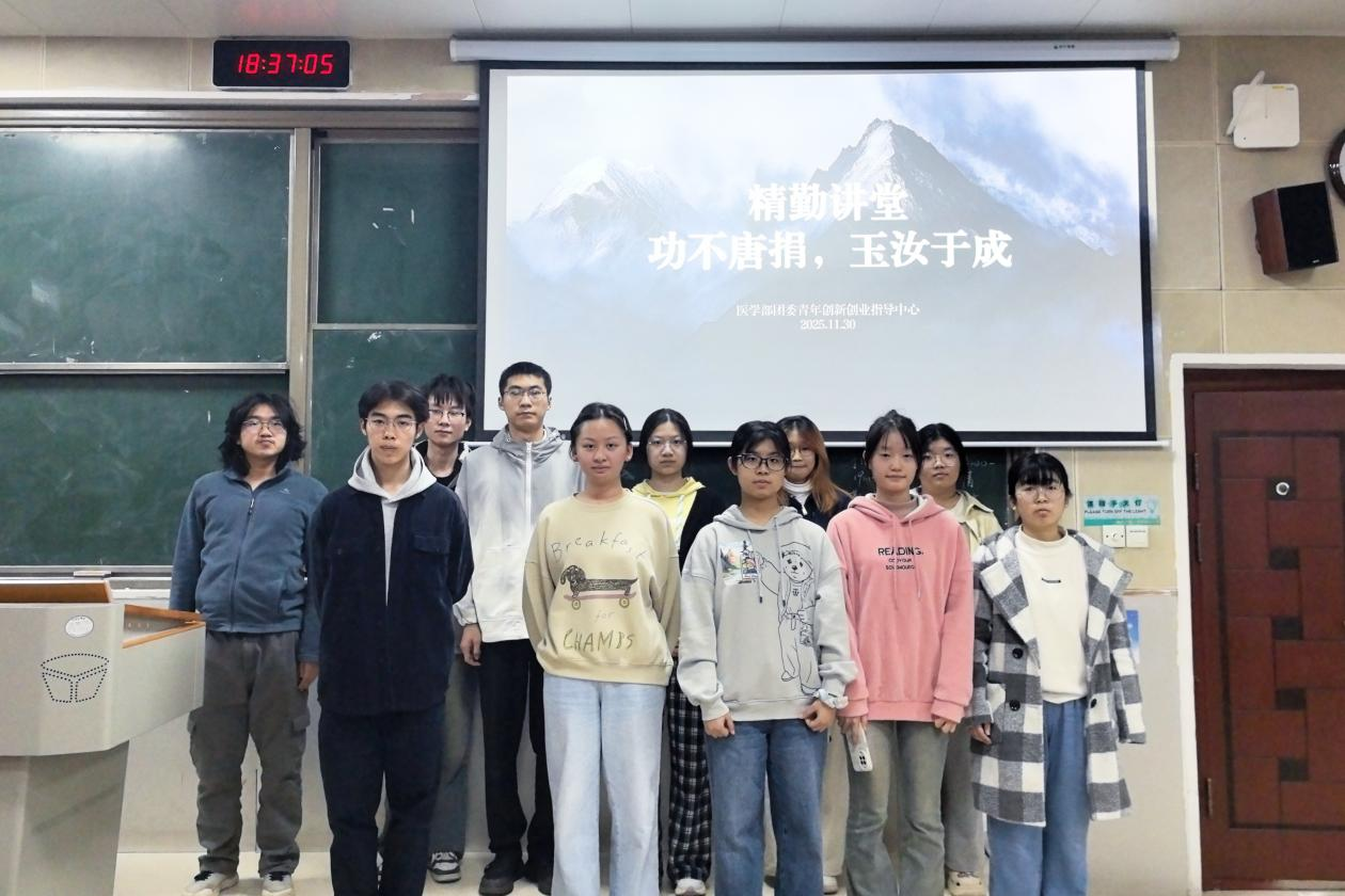 11月30日晚,医学部团委青年创业创新指导中心在仁医楼306教室举办“功不唐捐,玉汝于成”精勤讲堂。此次讲堂由2023级卓越医生班胡若扬担任主讲人,医学部部分同学参加。