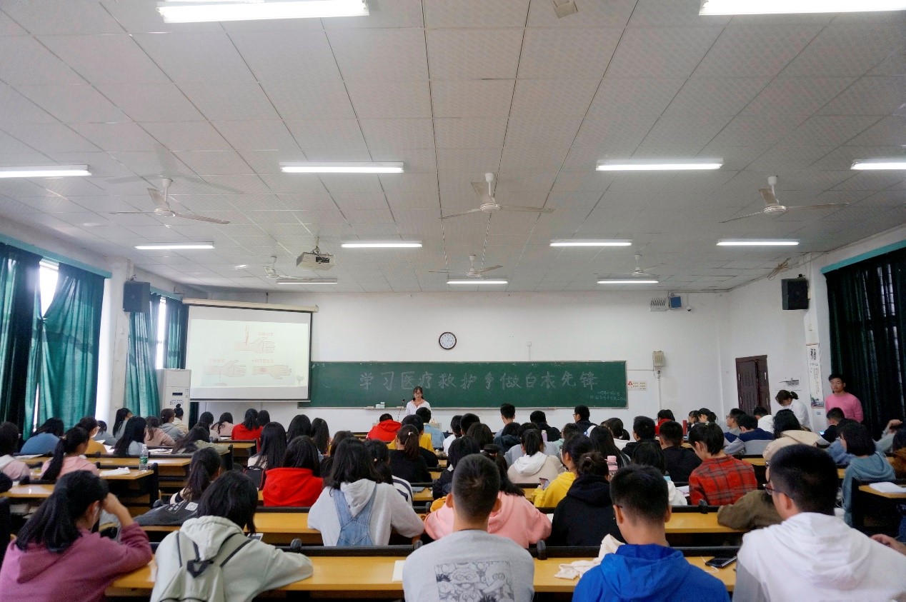10月31日中午12点半,我院团委青年发展工作部于勤医楼八教室开展了以“学习医疗救护,争做白衣先锋”为主题的野平团校团课。知行合医健康知识宣讲团的成员贺玮、胡萍受邀作为此次团课的主讲人,技能班全体成员参与此次团课。