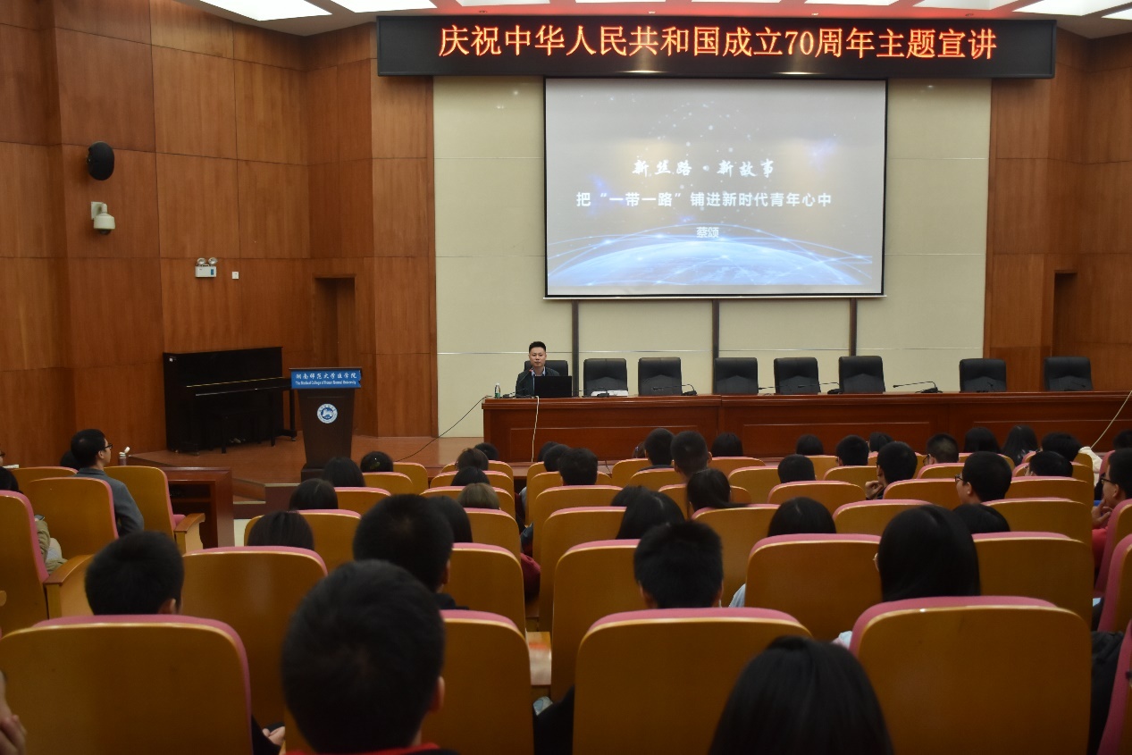 10月25日晚七点半,我院在仁医楼学术报告厅举办庆祝中华人民共和国成立70周年主题讲座,宣传部副部长蔡颂应邀主讲“新丝路·新故事:——把‘一带一路’铺进新时代湖湘青年心中”,院党委书记鄢朝晖出席此次讲座,团委书记(代)张明明主持讲座。